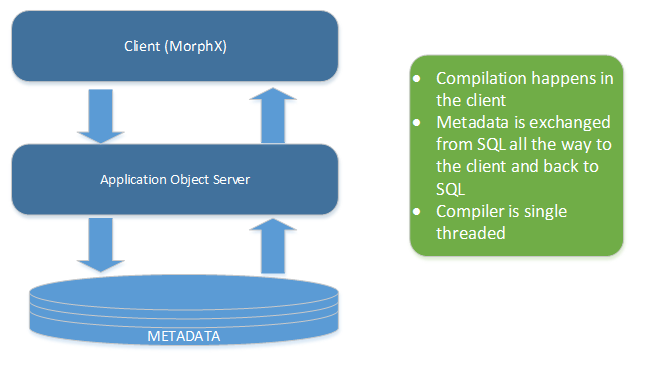 It is important to note that in earlier versions of Microsoft Dynamics AX the build performance is affected by the metadata moving from the client to the server metadata. In addition, the long compiling times are due to the deserialization of metadata and in memory cache.