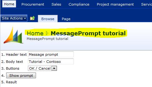 When you create a page in Enterprise Portal, you will add it to the navigation to enable users to access it. This walkthrough demonstrates how to add the Tutorial_MessagePrompt page to the Quick Launch navigation for the Sales module site in Enterprise Portal. It illustrates the following tasks: