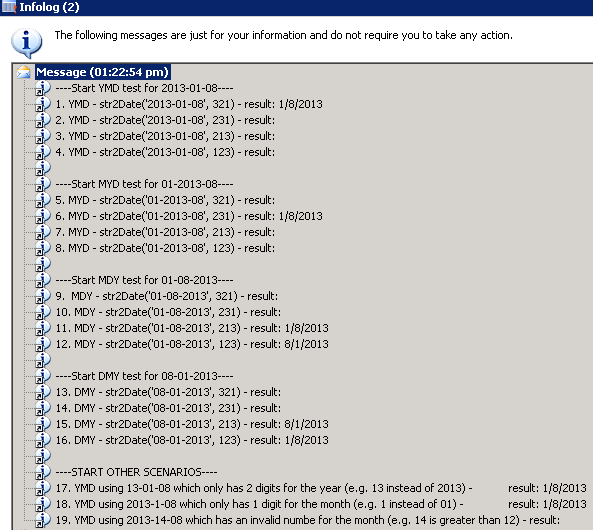 info (strFmt("2. YMD - str2Date('%1', 231) - result: %2", dateStrYMD, str2Date(dateStrYMD, 231)));