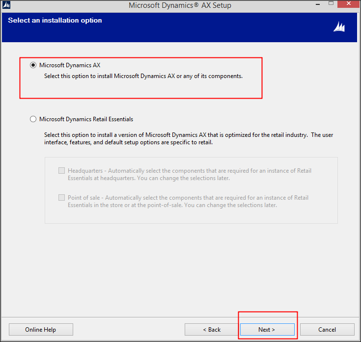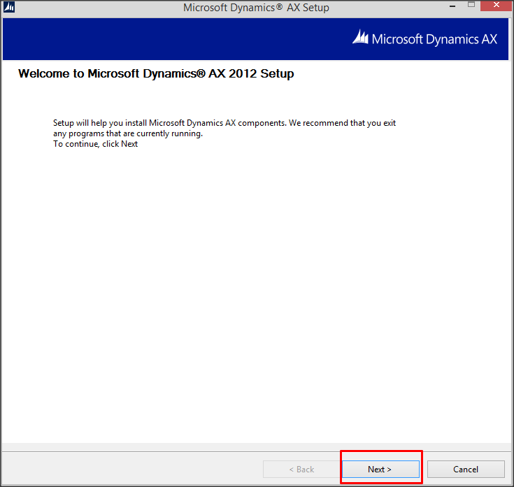 12- In the installation screen Select "Microsoft Dynamics AX" then click next.