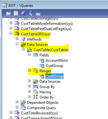 Now if you look at Ranges, we see that CustGroup lies here. That means, the query has a range and is defined by CustGroup.