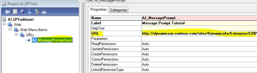 6. Specify the URL property, which has the following form: Module/Enterprise%20Portal/PageName.aspx. The Tutorial_MessagePrompt page is found in the main Enterprise Portal site, so it does not have a Module in its path. The value you must enter for the URL property to access the Tutorial_MessagePrompt page is: http://<<server>>/sites/DynamicsAx/Enterprise%20Portal/Tutorial_MessagePrompt.aspx